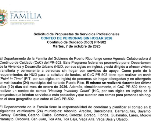 Solicitud de Propuestas de Servicios Profesionales – Conteo Personas sin Hogar 2026 CoC PR-502